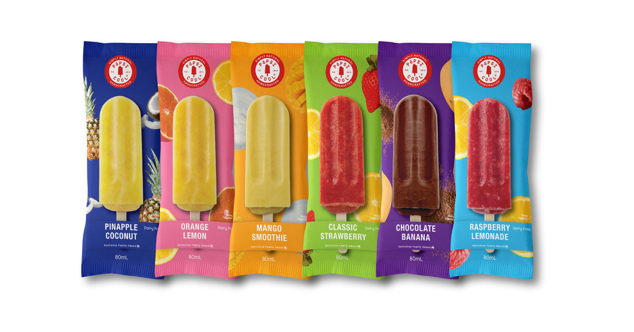 Mango Smoothie, Pineapple Coconut, Chocolate Banana, Raspberry Lemonade, Classic Strawberry, Orange Lemon.