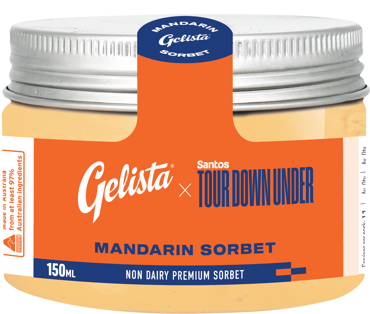 Vanilla Bean, Lightly Salted Caramel Macadamia, Classic Chocolate, Blood Orange & Dark Chocolate, Coconut with Raspberry, Mango with Passionfruit Swirl. Mandarin Sorbet, made in collaboration with the Santos Tour Down Under. While stocks last.